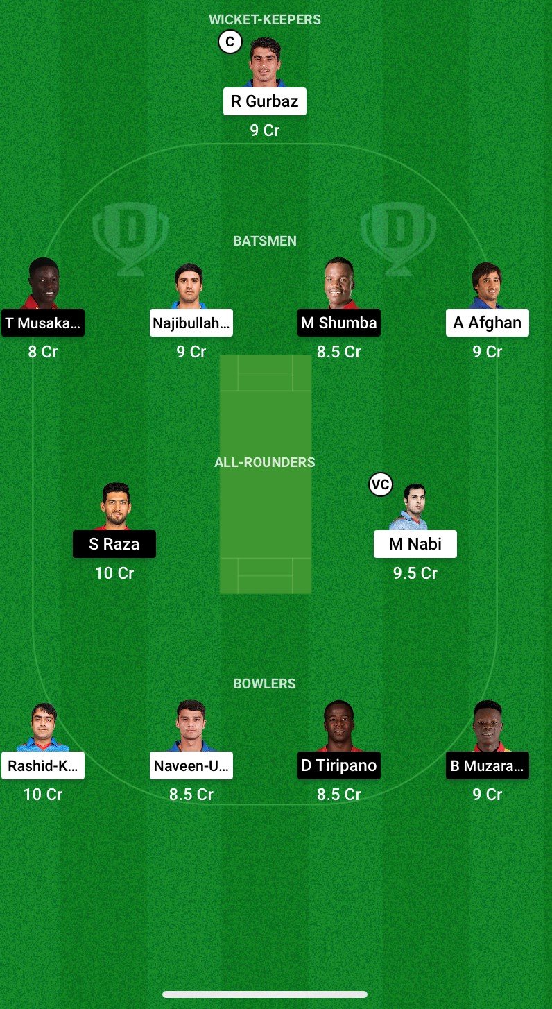 Zimbabwe:Milton Shumba, Richmond Mutumbami (WK), Sean Williams (C), Sikandar Raza, Wesley Madhevere, Tinashe Kamunhukamwe, Blessing Muzurabani, Donald Tiripano, Ryan Burl, Richard Ngarava and Brandon Mavuta