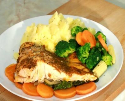 Baked Salmon with Grilled Vegetables and Mash Potato