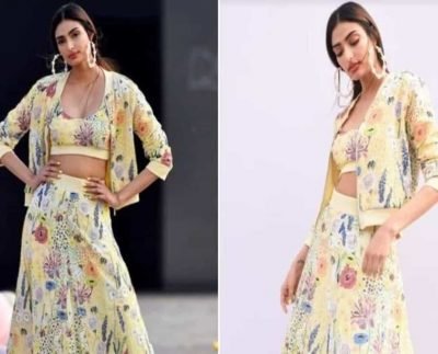 For the show, Athiya wore a yellow lehenga choli set that had an exaggerated floral print. The choli had an…