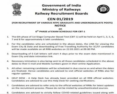 RRB NTPC 6th phase exam dates released, exam city link to be activated today