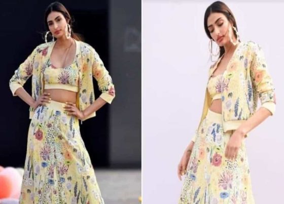 For the show, Athiya wore a yellow lehenga choli set that had an exaggerated floral print. The choli had an…