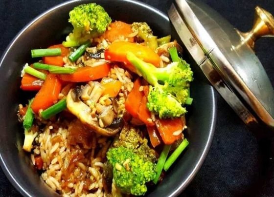 Pot rice with vegetables in soya garlic sauce
