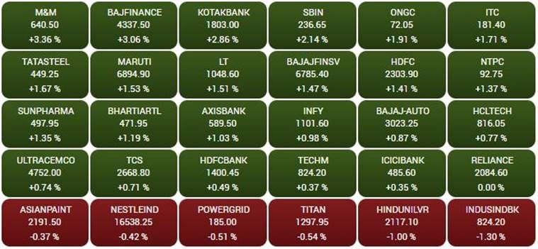 Among gainers, Mahindra & Mahindra (M&M), Bajaj Finance, Kotak Mahindra Bank, State Bank of India (SBI), Oil and Natural Gas Corporation (ONGC) and ITC were driving the BSE benchmark, while IndusInd Bank, Hindustan Unilever (HUL), Titan Company and Power Grid Corporation of India were among the top laggards. See heatmap below