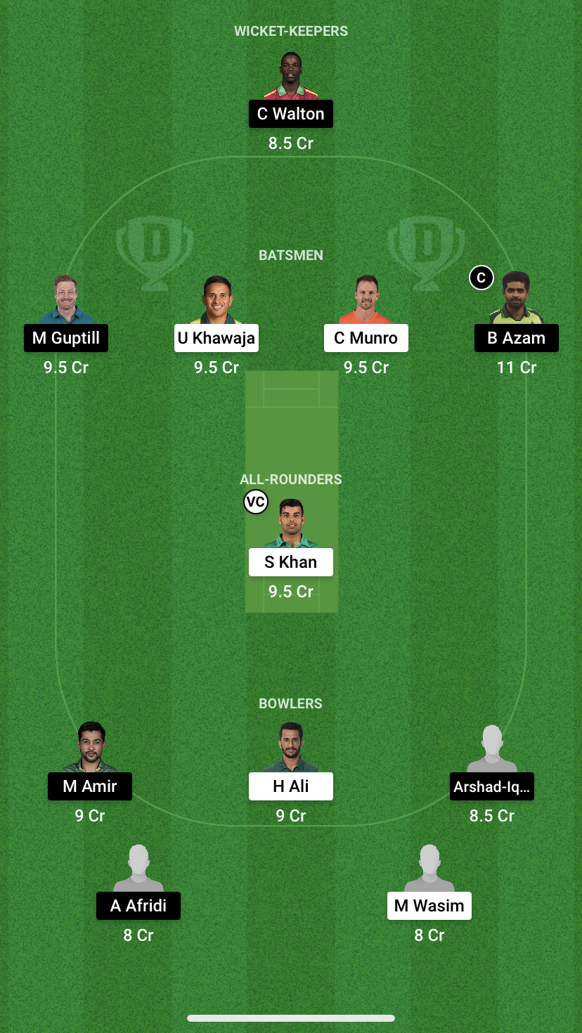 Sharjeel Khan, Martin Guptill, Babar Azam, Chadwick Walton (wk), Thisara Perera, Najeebullah Zadran, Imad Wasim (c), Mohd Amir, Arshad Iqbal, Waqas Maqsood, Qasim Akram