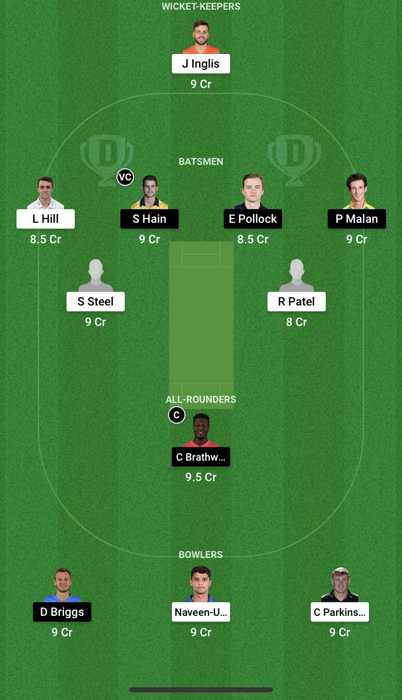 Leicestershire: Scott Steel, Josh Inglis (wk), Arron Lilley, Colin Ackermann (c), Lewis Hill, Rishi Patel, Ben Mike, Callum Parkinson, Louis Kimber, Naveen-ul-Haq, Gavin Griffiths