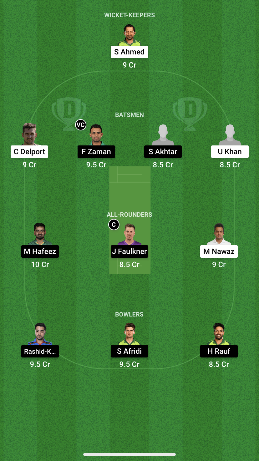 Sohail Akthar (c), Fakhar Zaman, Mohammad Hafeez, Faheem Ashraf, Ben Dunk, Tim David, Rashid Khan, Haris Rauf, James Faulkner, Shaheen Afridi and Ahmed Daniyal