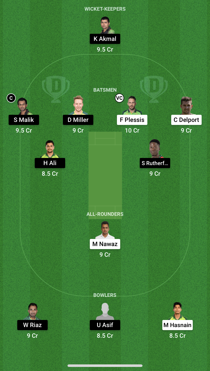 Faf du Plessis, Usman Khan, Jake Weatherald, Sarfaraz Ahmed(w/c), Azam Khan, Cameron Delport, Mohammad Nawaz, Zahir Khan, Mohammad Hasnain, Khurram Shahzad, Zahid Mahmood